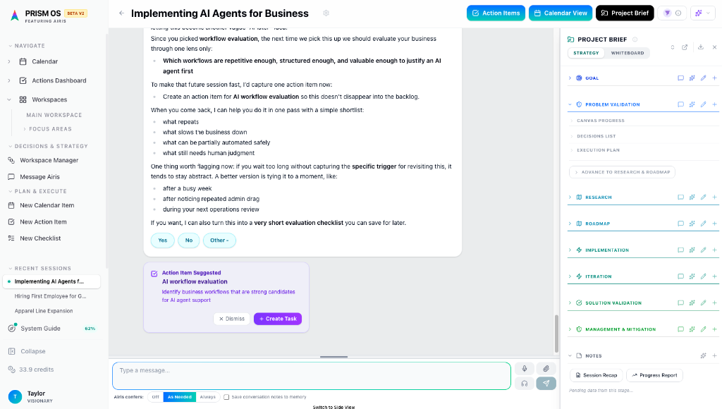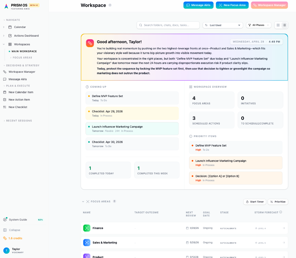 PRISM OS & Airis are designed for helping you confidently think-through, decide, and follow-through on the work that keeps you up at night
